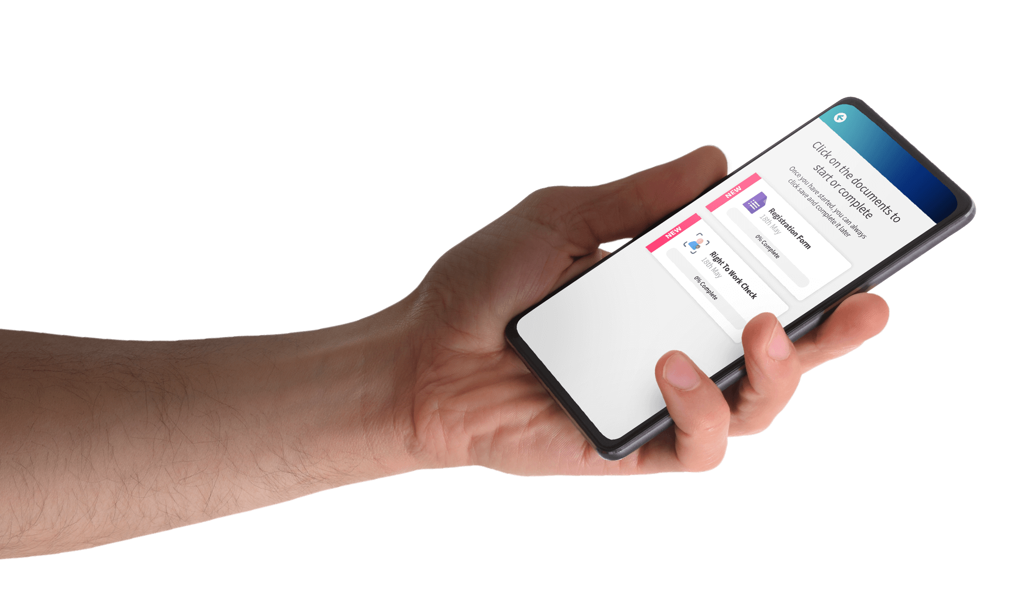 Sarah sees that Joe has completed 100% of the registration form on her iPad and has just passed his digital right to work check.